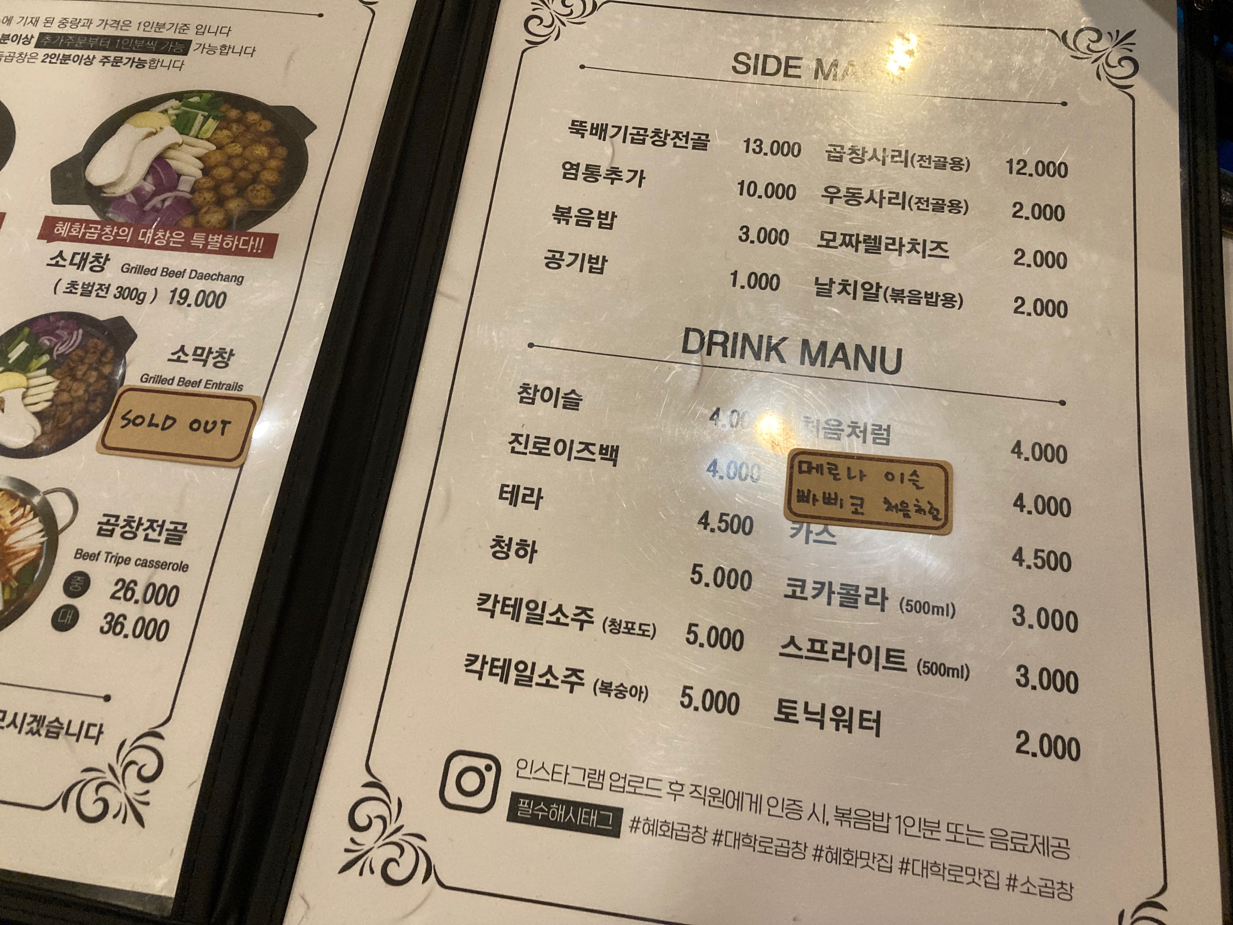 저기 있는 곱창전골도 너무 먹고 싶은데 생각보다 혜화는 너무 먼 곳…*_*